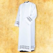 Alba iz preproste lahke bele tkanine. Alba ima preprosto obliko in čipko z IHS motivom na rokavu in na dnu.