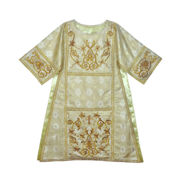 Rokav dalmatike je odprt (tradicionalne/rimski kroj). Dalmatika je podložena s satenastim blagom.