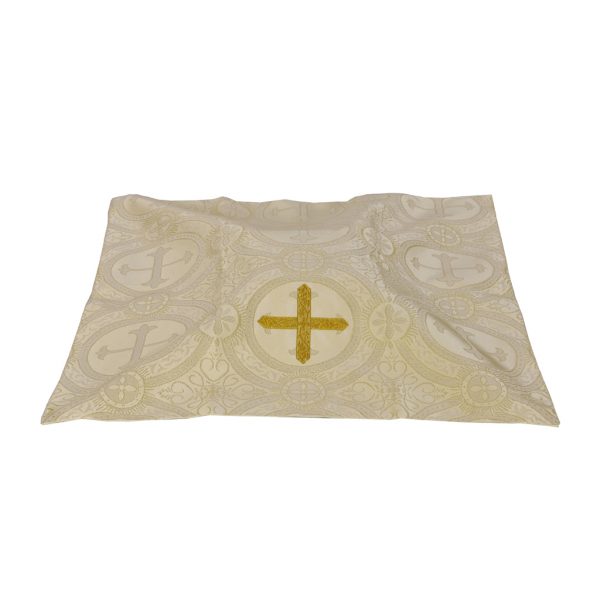 Set je sestavljen iz baročnega mašnega plašča , veluma za kelih, manipla, burza in štole. Material iz brokata s križnim dizajnom. Baročni mašni plašč je zlato obrobljen. Notranjost je podložena s satenasto tkanino. Na notranji strani plašča je tudi vrvica.