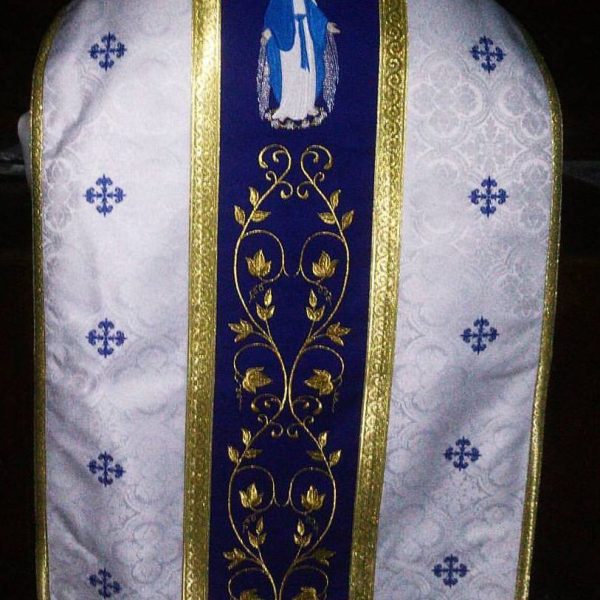 Set je sestavljen iz baročnega mašnega plašča , veluma za kelih, manipla, burze in štole. Material je iz belega brokata in modrega platna z zlato vezenino. Baročni mašni plašč je zlato obrobljen. Notranjost je podložena s satenasto tkanino. Na notranji strani plašča je tudi vrvica.