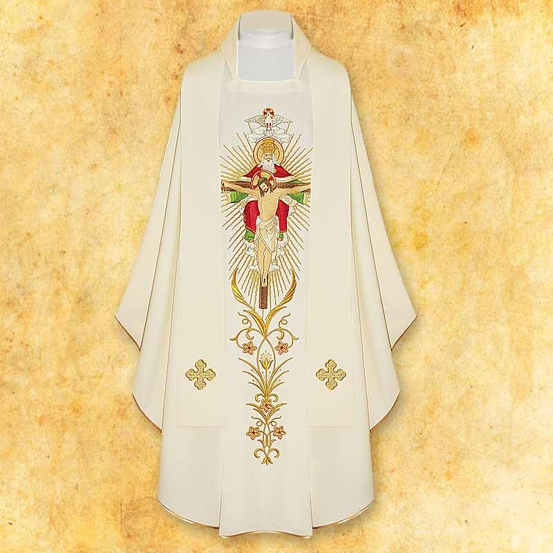 Plašč je iz preproste bele tkanine. Ima bogato vezenino spredaj in zadaj. Vezenina je v več zlatih in barvnih odtenkih. Spredaj je motvi svete trojice zadaj pa Alfa in Omega.