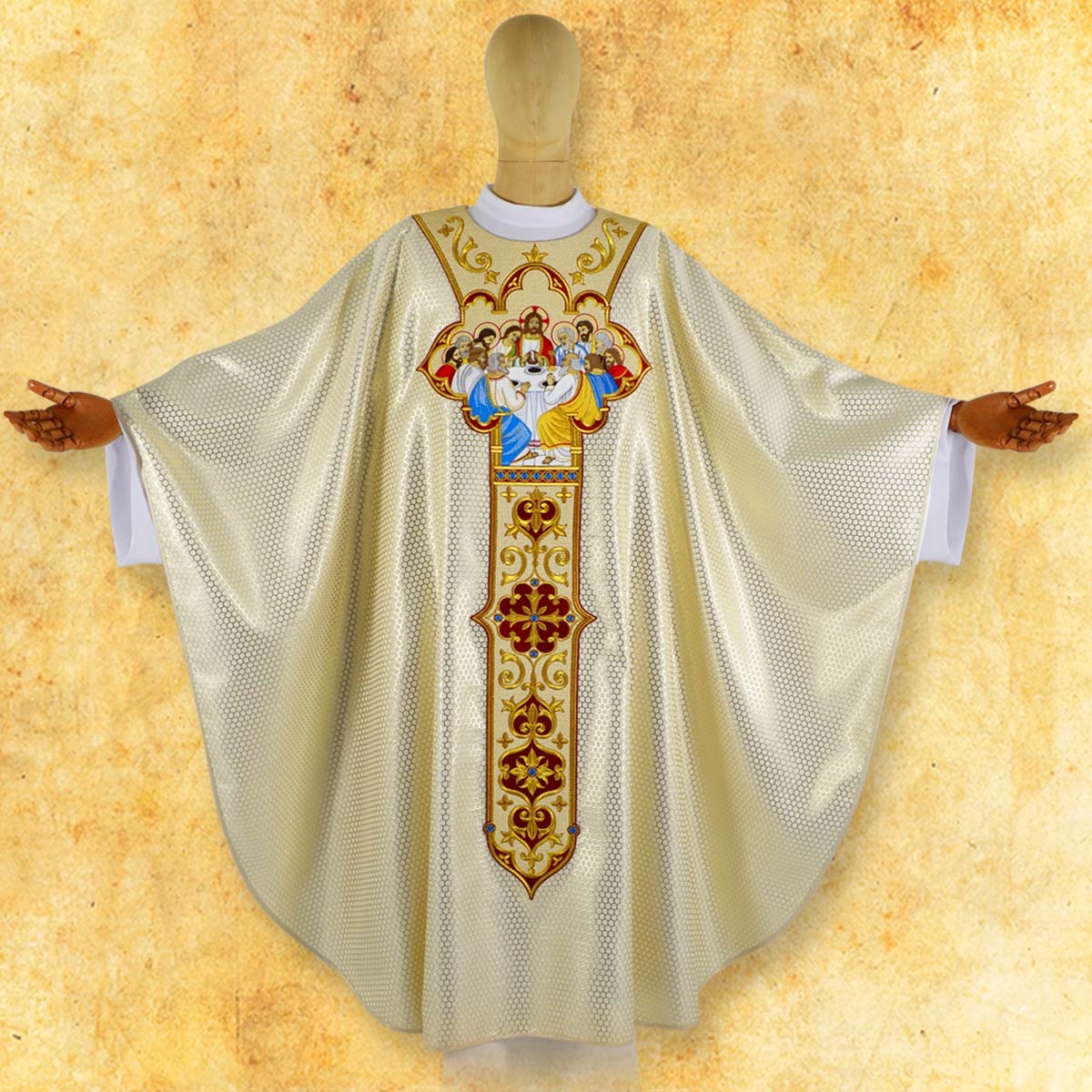 Plašč je iz panjskega dizajna vele barve. Ima bogato vezenino spredaj in zadaj. Vezenina je v več zlatih in barvnih odtenkih. Spredaj je zelo lepa vezenina zadnje večerje zadaj pa vezenina križa