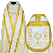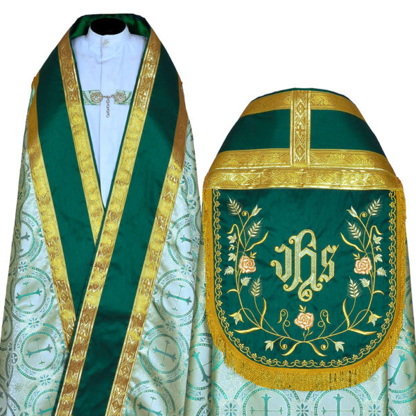 Pluvial je narejen iz brokata/damasta s križnim dizajnom. Porti in kapuca so iz svile, na celi kapuci pa je zlata vezenina. Pluvialu sodi štola. Notranjost je podložena s podobnim satenastim blagom.