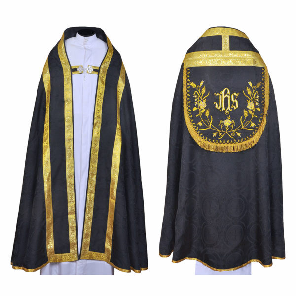 Pluvial je narejen iz brokata/damasta s križnim dizajnom. Pluvial je obrobljen z 4 cm široko zlato obrobo. Kapuca je v celoti vezena z zlatim motivom IHS. Pluvialu sodi štola. Notranjost je podložena s podobnim satenastim blagom.