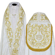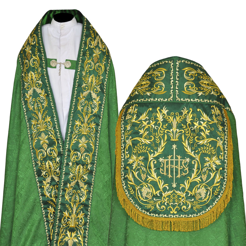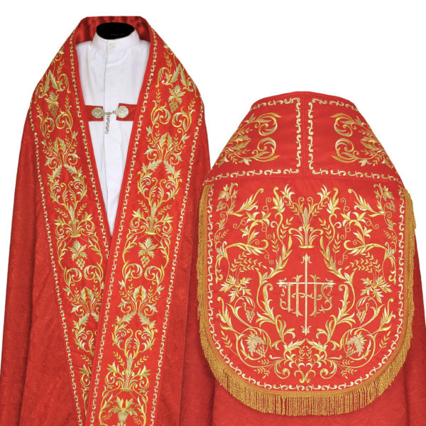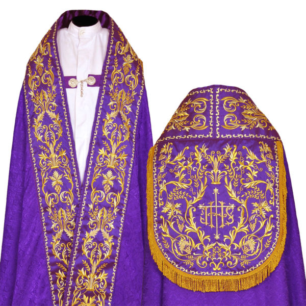 Pluvial je narejen iz brokata/damasta s križnim dizajnom. Porti in kapuca pa iz svile in so v celoti vezene z 8 zlatimi nitmi. Pluvialu sodi štola. Notranjost je podložena s podobnim satenastim blagom.