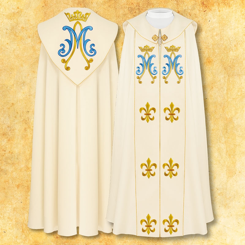 Preprost pluvial za vse priložnost z zelo lepim vezenjem na porti (monogram in kraljevske lilije) in kapuci (Marijin monogram). Pluvial je iz mehke in lahke poliesterske tkanine.