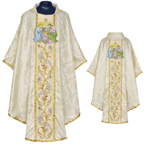 Mašni plašč je izdelan iz svilenastega damasta s križnim dizajnom. Porta je v celoti vezena. Sveta družina je zelo lepo in natančno vezena z več kot 27 različnimi nitmi. Plašču sodi pripadajoča štola, ki ima vezane zlate križe na dnu in pri vratu. Možnost mašnega seta: velum za kelih, manipel, burza in štola.